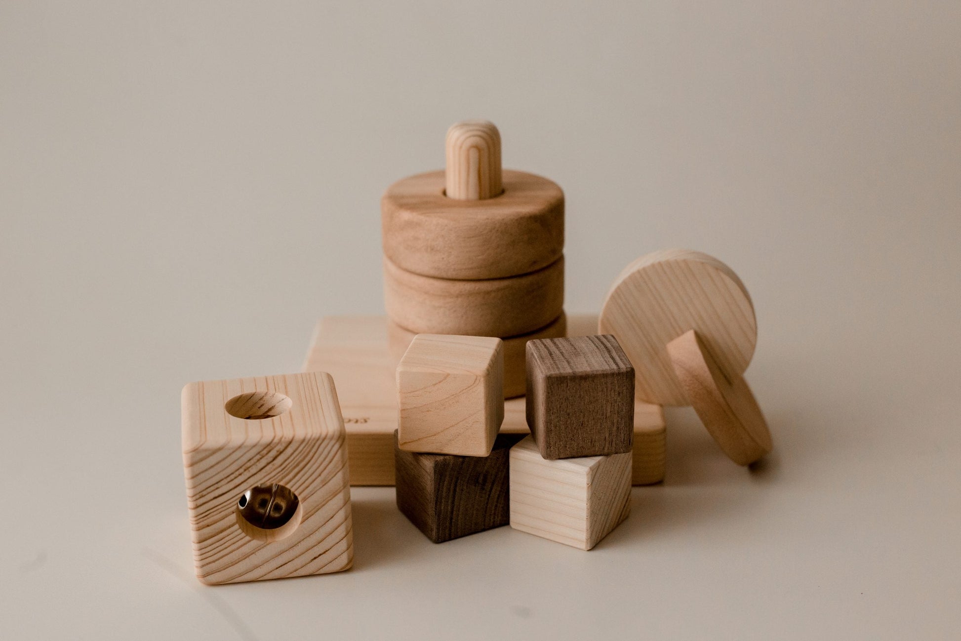 The perfect gift set for anyone welcoming a little one into the world. This set is made up of our Montesorri inspired toys. Includes: Dual Discs, Montessori Vertical ring stacker, Cube Rattle & 4 blocks