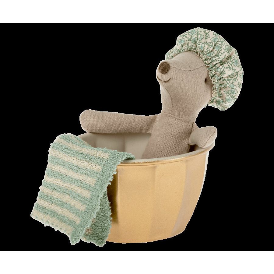Rub a Dub Dub there is a mouse in the tub. Ms. Mouse gets squeaky clean in the tub, but her ears stay dry with her shower cap. She uses a cute gold metal cup for her tub.