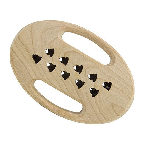 The next generation of baby rattles! This rattle has it all - crafted from cherry hardwood, no chemical coating, a festive jingle bell sound, easy-to-grip handles. The rattle measures 5" long, 3.5" wide, and 1" thick. Comes shrink-wrapped.