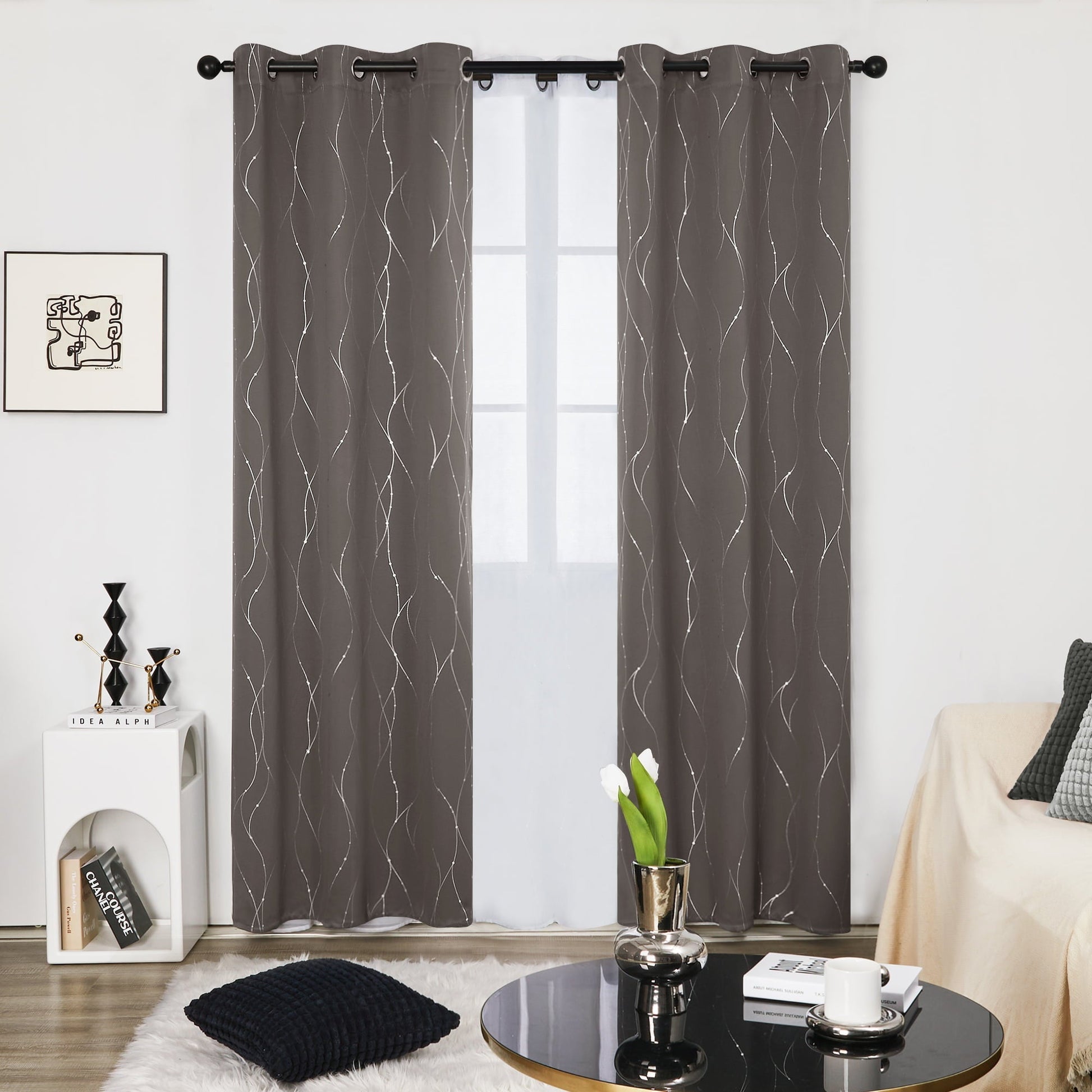 - DESIGN and TEXTURE: Deconovo blackout panels are made of 100 percent high-quality polyester fabric. Imported, each blackout curtain panel has foil-printed wave lines with a dots pattern and they are silky soft drapery, and soft to the touch.