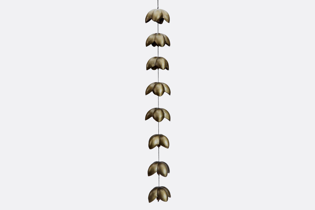 Cast metal blossom motif pendants on a string.