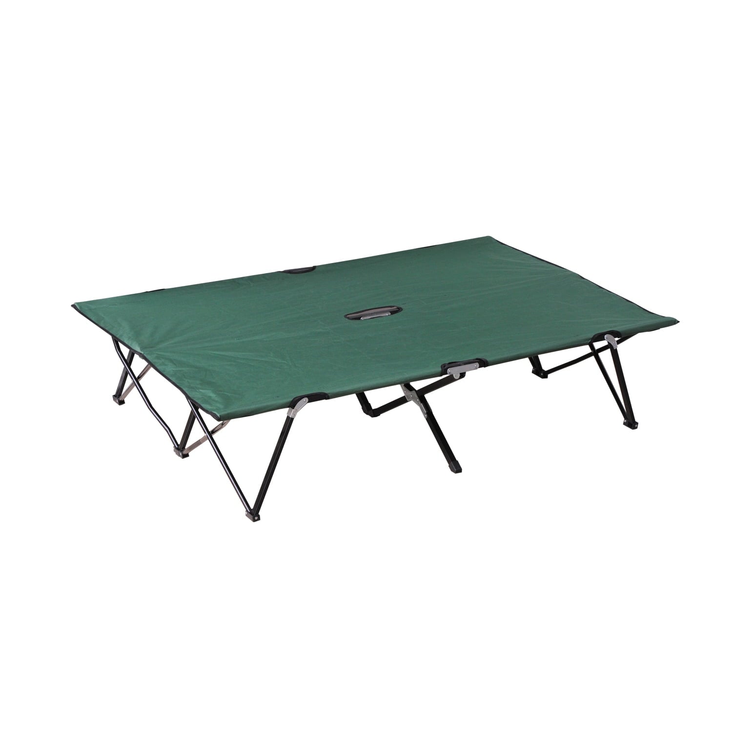 With the portable two-person double folding camping cot for adults from Outsunny, you'll always have a comfortable place to rest while on the go. This lightweight cot has enough room for two people so that you and a friend can go camping without having to sleep on the cold, hard ground. The steel frame and durable Oxford fabric can hold up to 300 pounds in comfort, while the elevated design allows for proper airflow. It's foldable for easy storage, and even comes with a portable carrying bag, making it your best possible outdoor camping partner.